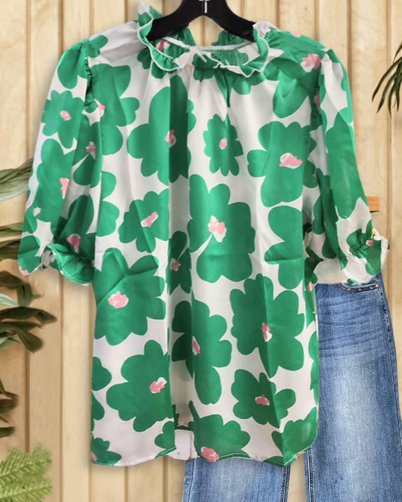 Floral Print Ruffled Collar Pretty Puff Sleeve T-Shirt